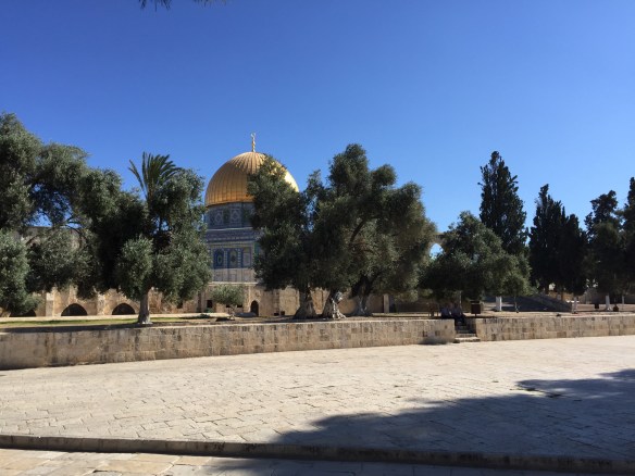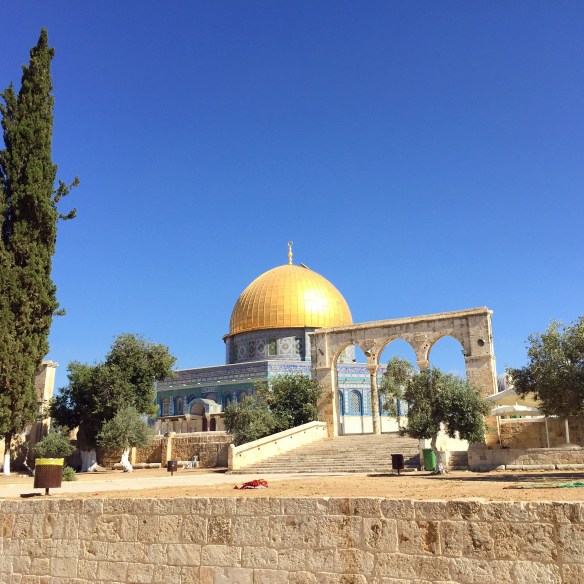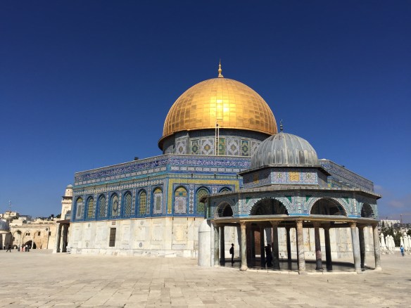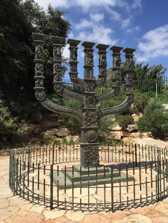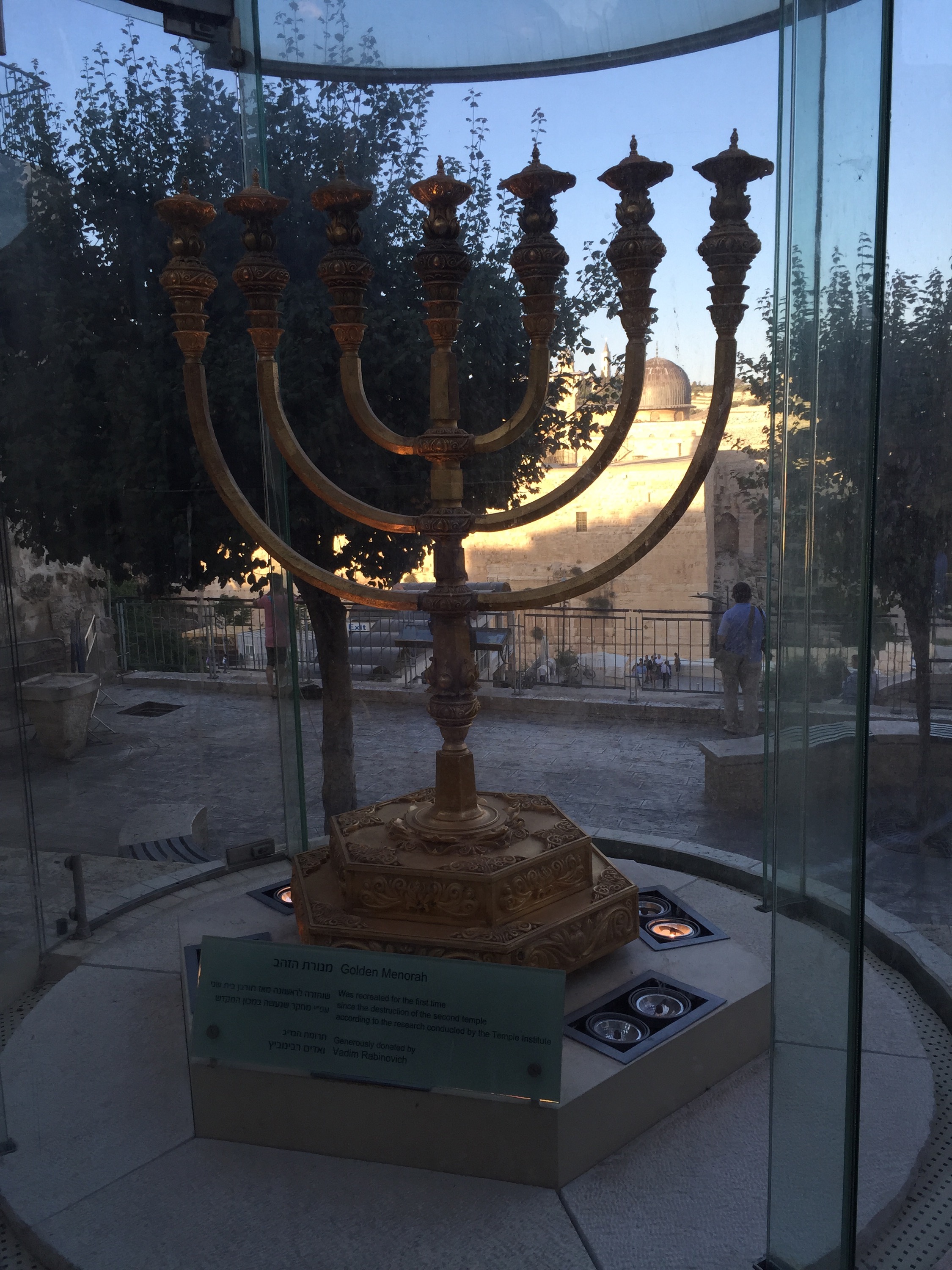 Tempelplatsen har ni kanske hört talas om tidigare, men det är ju den plats här i Jerusalem där både judar och muslimer tror att The foundation stone finns belägen och att det var där Gud en gång började sin skapelse. Från den platsen så utgick hela skapelsen och denna plats är därför den heligaste av de heligaste. Judarna har haft två tempel där tidigare, men båda har blivit förstörda, först av babylonierna och sedan av romarna. Idag står Klippmoskén där, alltså en muslimsk byggnad, men judarna drömmer och hoppas på att de med Guds hjälp en dag ska kunna bygga det utlovade tredje templet som det står om i Bibeln på just denna plats. Redan nu har man börjat bygga olika viktiga saker som ska stå i det kommande templet, bland annat en jättestor Menora som ni ser här nere 🙂