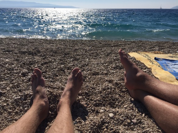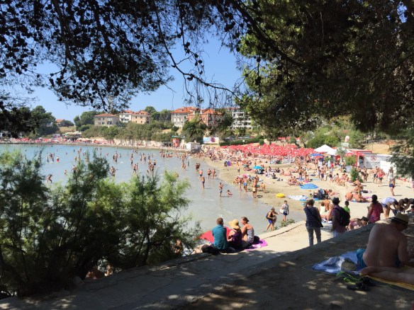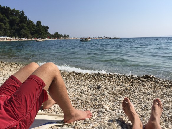 Hem och sova och sen blev det alltså onsdag och dags att lämna Split och åka ut till Vis. Och hit anlände vi vid lunchtid, så efter att vi knackat lite dörr och letat rätt på någonstans att sova käkade vi en välförtjänt pizza 🙂 Därefter blev det en eftermiddag på stranden med sol och bad, Coca Cola och godisnappar. Ja, ni hör, vi har det rätt bra 🙂