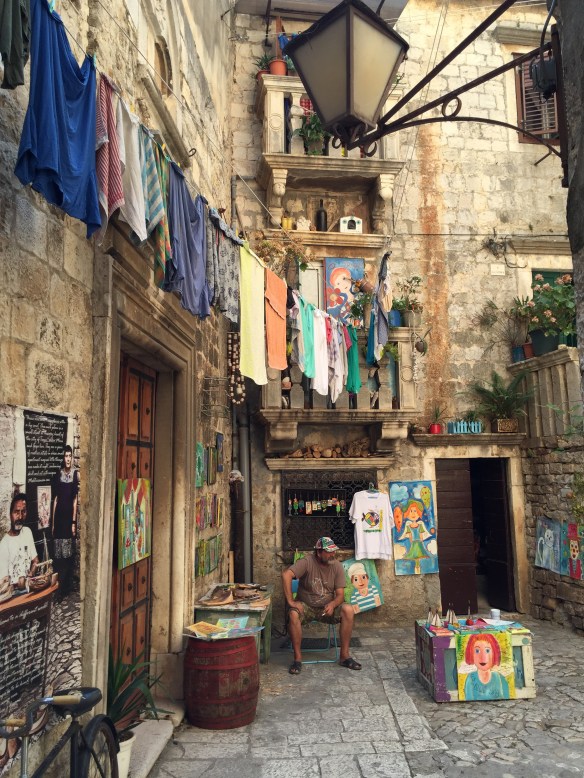 Sista dagen i Split, also known as fjärde dagen på resan eller helt enkelt igår, blev en härlig avslutning 🙂 På förmiddagen tog vi bussen till den lilla byn Trogir som ligger 30 minuter norr om Split. Där strosade vi omkring bland restauranger, marknadsstånd och småbutiker, hittade ett gammalt fort ifrån urminnes tider och tog det väldigt chill. Verkligen jättemysiga kvarter! Och vi blev varsin ”Kroatien-handduk” rikare 🙂