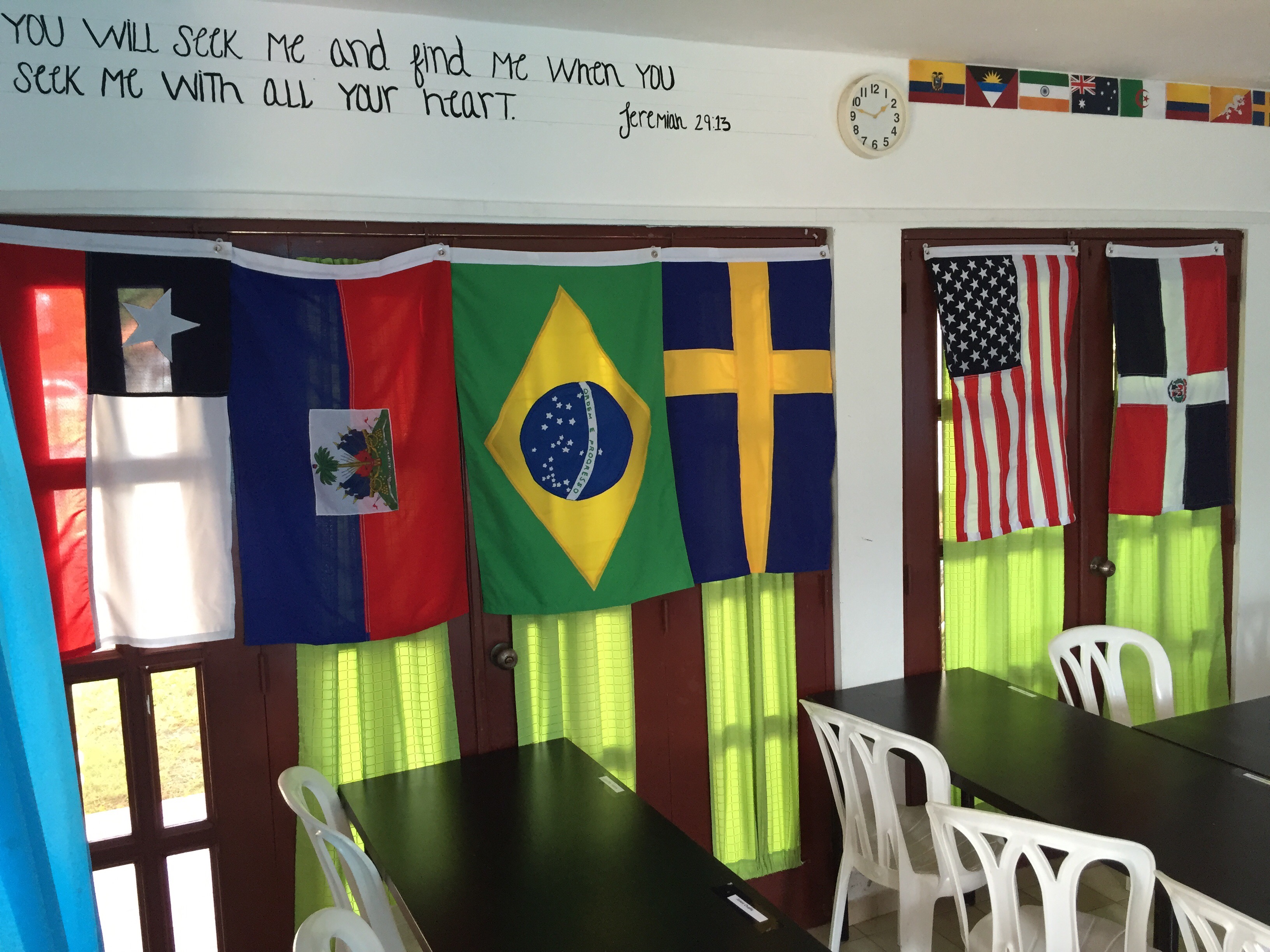 I eftermiddag kommer våra två sista klasskamrater, två tjejer ifrån Haiti. Det gör oss till 15 studenter totalt ifrån 6 olika nationer. I klassrummet hänger varje lands flagga fint längs ena väggen.