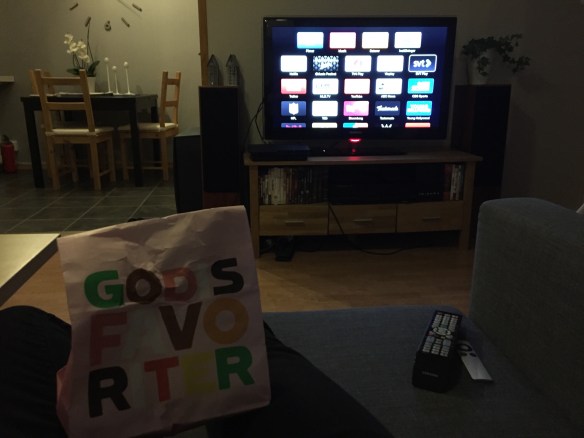 Hem till brorsans lya i Södertälje och filmmys med godis, chips och ostisar 🙂 MUMS!