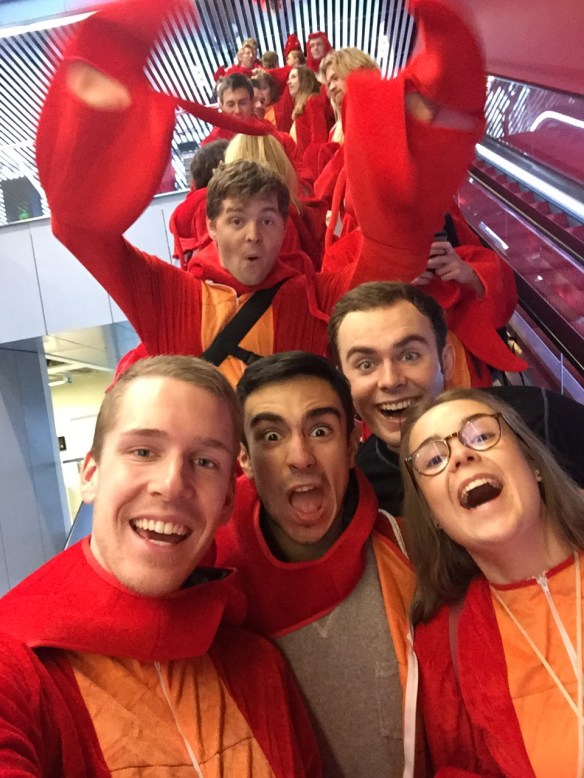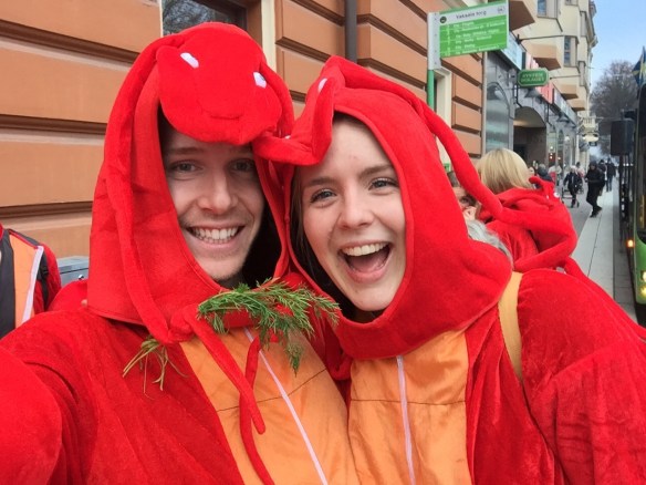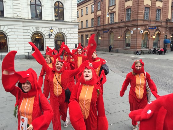 Sen klockan 12 begav vi oss ut på stan för att dansa och åka rulltrappa, besöka ekonomernas och juristernas bibliotek och busa lite grann och ta en sväng förbi fiskdisken på Saluhallen för att gråta en skvätt över våra fallna vänner (de döda kräftorna i disken, haha) 😉 Detta var en parad som uppskattades av många 🙂 90 kräftor som vandrade omkring på stan skapade uppståndelse och många som ville ta kort och filma oss 🙂 KUL grej!